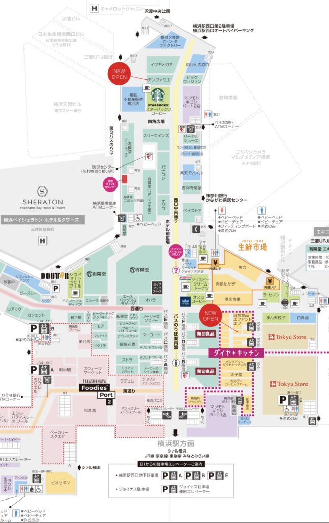 JR「横浜」駅地下中央改札から、西口方面(CIAL・高島屋)方面に進み、半地下へ降りていきます。